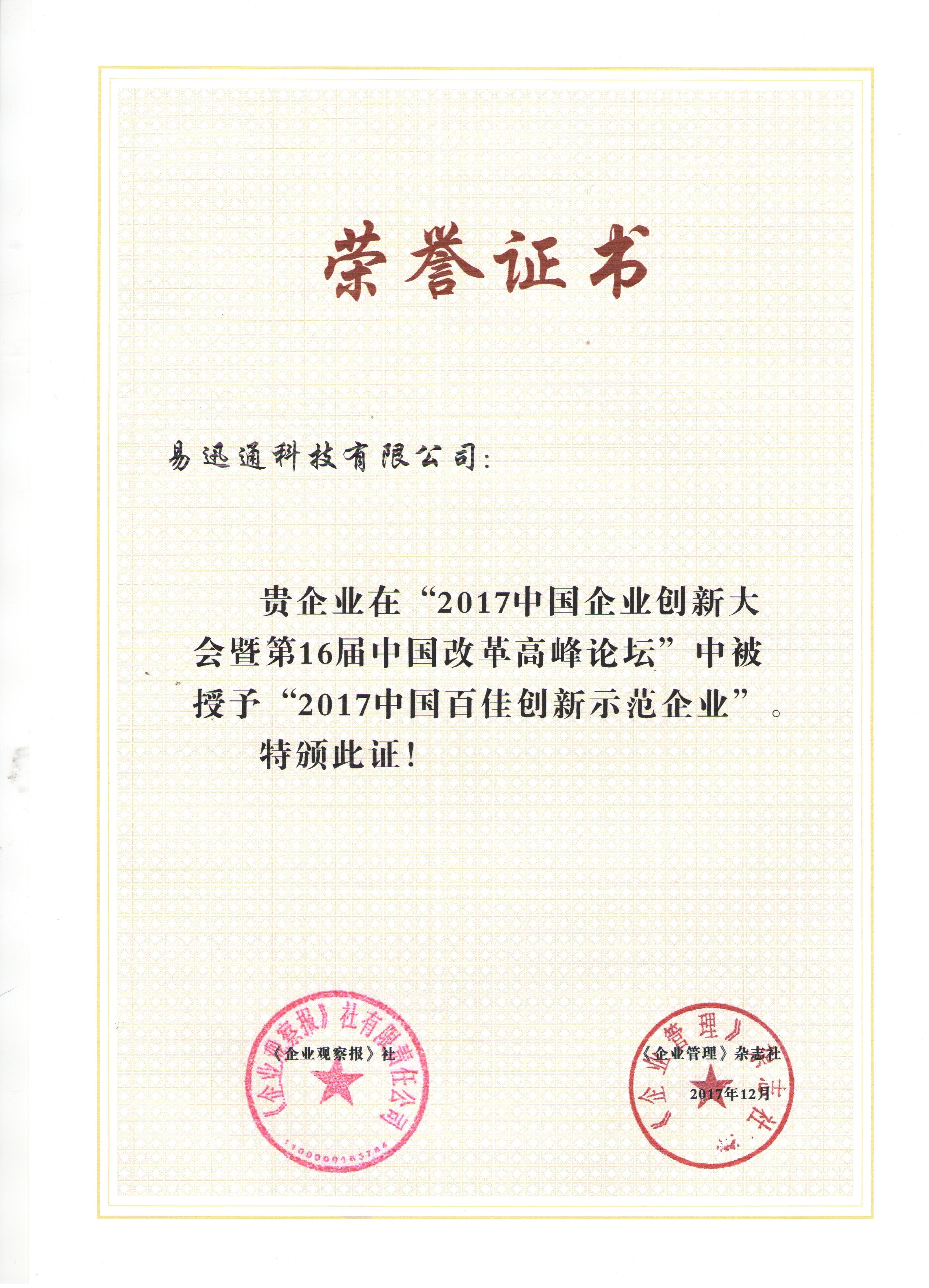 榮獲“中國百佳創(chuàng)新示范企業(yè)”稱號